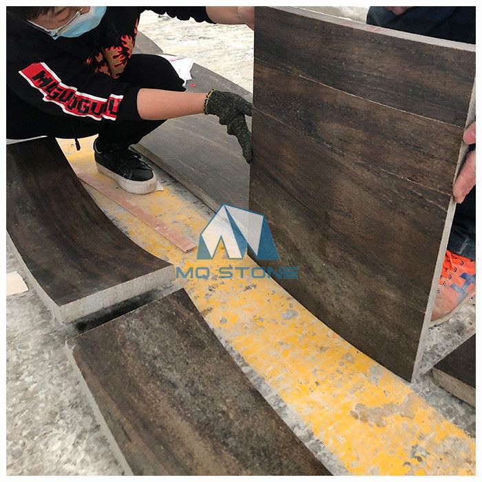 Masonry Quality Stone processed the brown granite wall tiles for a 5A Grade Office Building Lobby, the first-floor lobby have a curve wall and need a special cut, the brown granite facade tiles edges need 45 angles cut, to have a seamless effect. Below are the project's QC photos, which may let you know well about the granite wall facade items.
