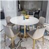The Calacatta White Marble Dining Table is a circular shape, the white marble tabletop is sleek with grey veins, match round pedestal base is an attractive mix. The table leg makes powder-coated metal. The veins in white marble stone are slightly different with each cut but make the tabletop is unique. Pair this table with counter-height side chairs for a complete look.